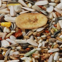Valmistusaineet: Valkoista auringonkukansiementä, safloria, raidallista auringonkukansiementä, kuorittua kauraa, tattaria, kurpitsansiementä, paisutettua vehnää, paisutettua maissia, riisiä, setripähkinöitä, valkoista hirssiä, valkoista daria, punaista durraa, porkkananpaloja, kanariansiemeniä, rusinoita, hernehiutaleita, saksanpähkinän paloja, banaania.