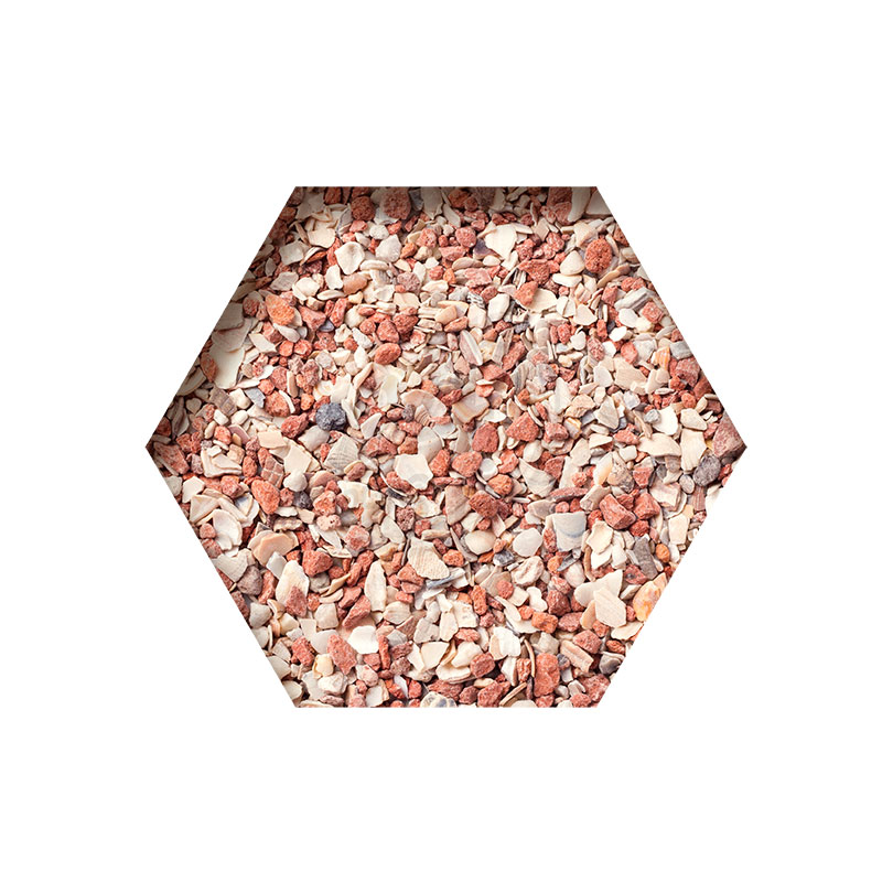 Koostumus: Kalkkipitoiset merenkuoret (osterinkuoret, simpukankuoret), punakivi, piikivimurska.